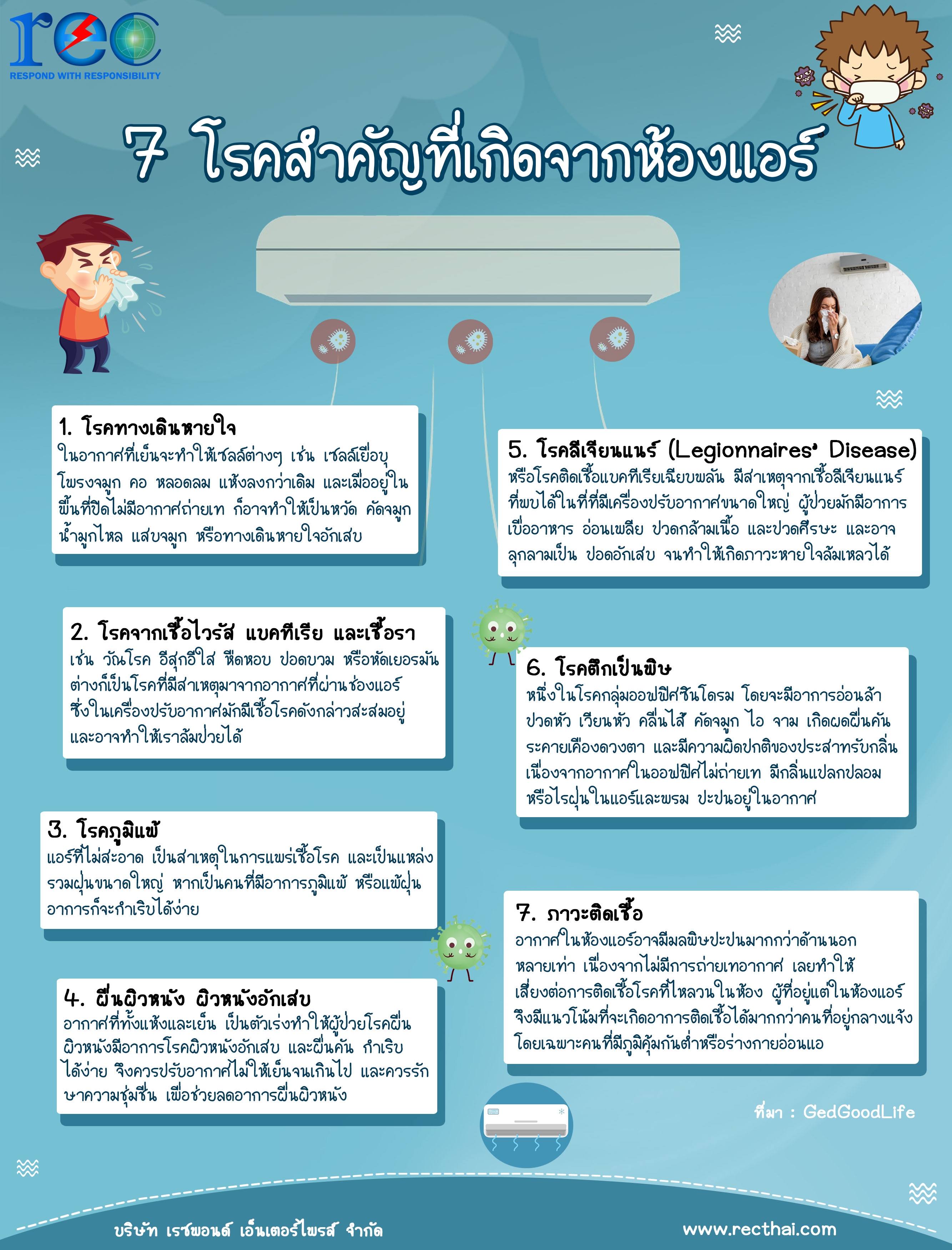 วันนี้ทางเว็บไซต์ recthai.com ได้จัดทำเป็น Infographic เสนอข้อมูลเกี่ยวกับโรคสำคัญที่เกิดจากห้องแอร์ ให้ทุกท่านได้อ่านกันค่า