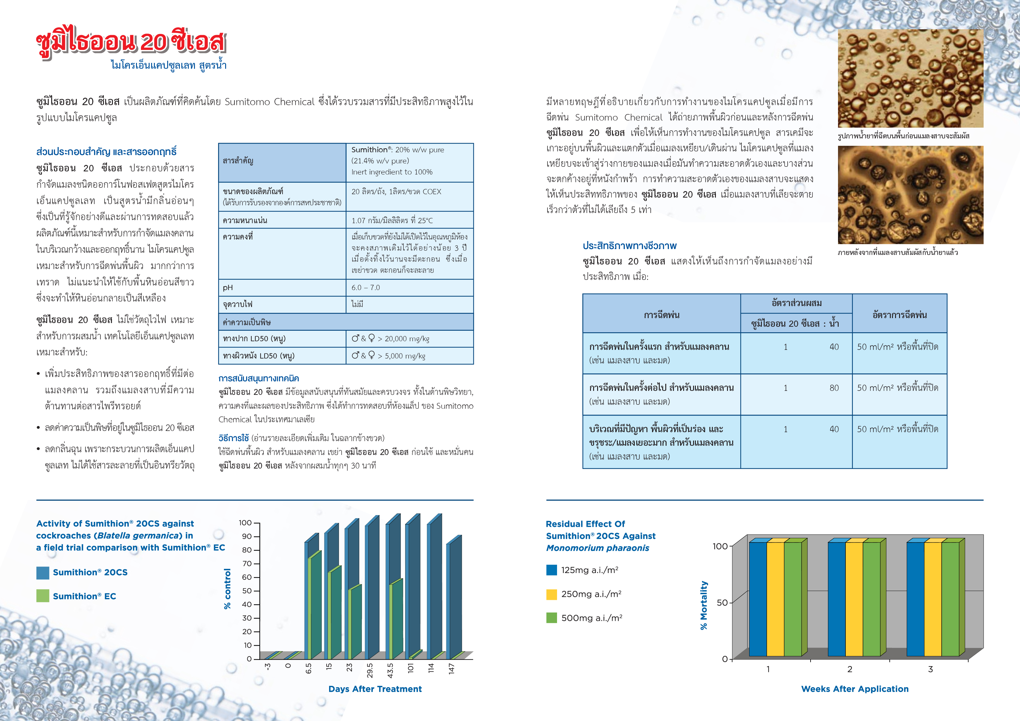 ซูมิไธออน 20 ซีเอส (Sumithion 20 CS) เหมาะกับการกำจัดแมลงสาบทุกชนิด เรือด เห็บ หมัด แมลงวัน และแมลงคลานเล็กๆ เนื่องจากเป็นสูตรไมโครเอ็นแคปซูล (enmicrocapsul) สารเคมีจะอยู่ในรูปแคปซูล คือจะมีการล็อคสารเคมีใว้ในแคปซูล ลดอัตราการสลายตัวในธรรมชาติ แคปซูลจะแตกแล้วสารเคมีจะออกมาเมื่อมีแมลงมาสัมผัส ทำให้สามารถตกค้างในพื้นที่ได้นาน 3-6 เดือน เพราะมีความคงทนมากกว่าสารเคมีทั่วที่อยู่ในรูปน้ำหรือน้ำมัน และที่สำคัญ ซูมิไธออน 20 ซีเอส (Sumithion 20 CS) ปลอดภัยต่อสัตว์เลี้ยงและสิ่งแวดล้อม สามารถใช้ฉีดพ่นได้แทบทุกสภาพผิว เป็นที่รู้จักและได้รับการยอมรับในหลายประเทศ